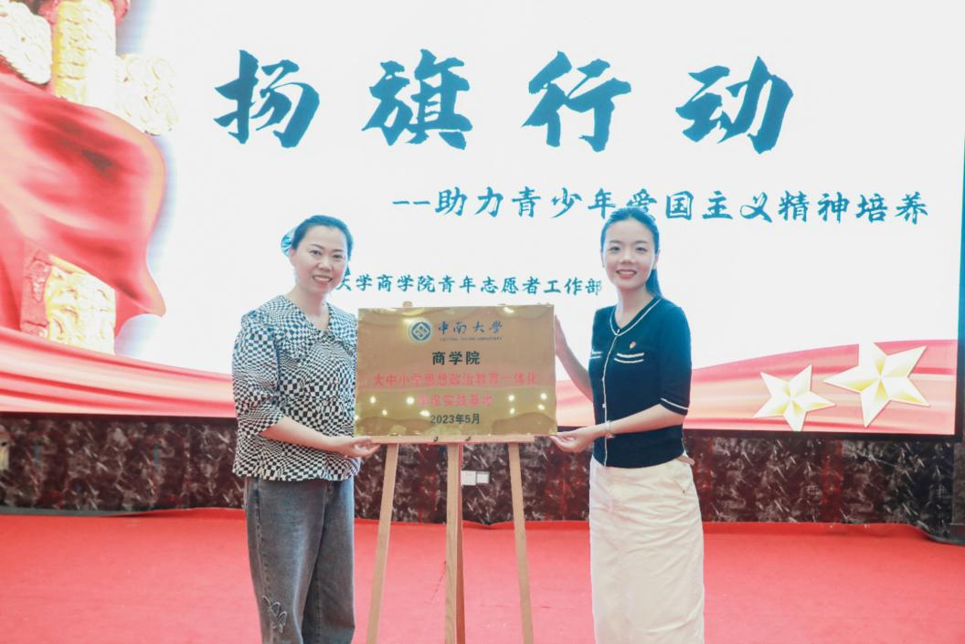 5月31日,william威廉中文官网与博才阳光实验小学联合举行“扬旗行动”——助力青少年爱国主义精神培养主题活动暨“william威廉中文官网大中小学思想政治教育一体化建设实践基地”授牌仪式。william威廉中文官网团委书记席添添老师、博才阳光实验小学德育主任吴婷和姚雁南老师出席活动。
