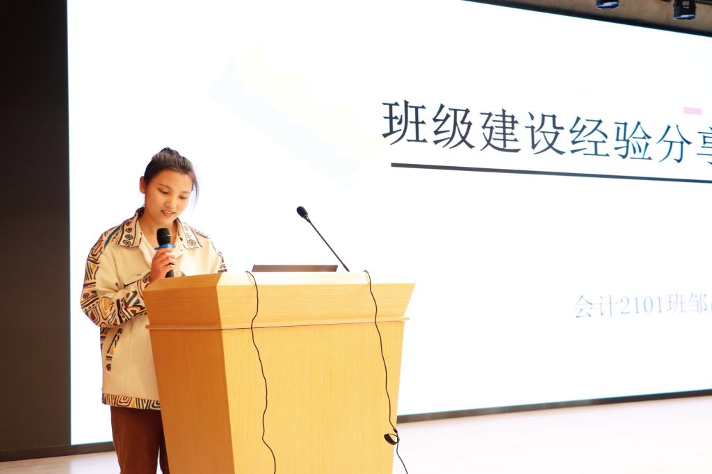 第三环节,优秀班集体建设经验分享。会计2101班班长邹晶认为要以身作则、积极向上、用心做事、以诚待人,从学风建设、班级活动和身心健康方面进行分享。会计2102班班长魏新晟展示了本班丰富多彩的班级例会、团建、班级活动,并表示正积极探索锻炼班级整体能力的方式。