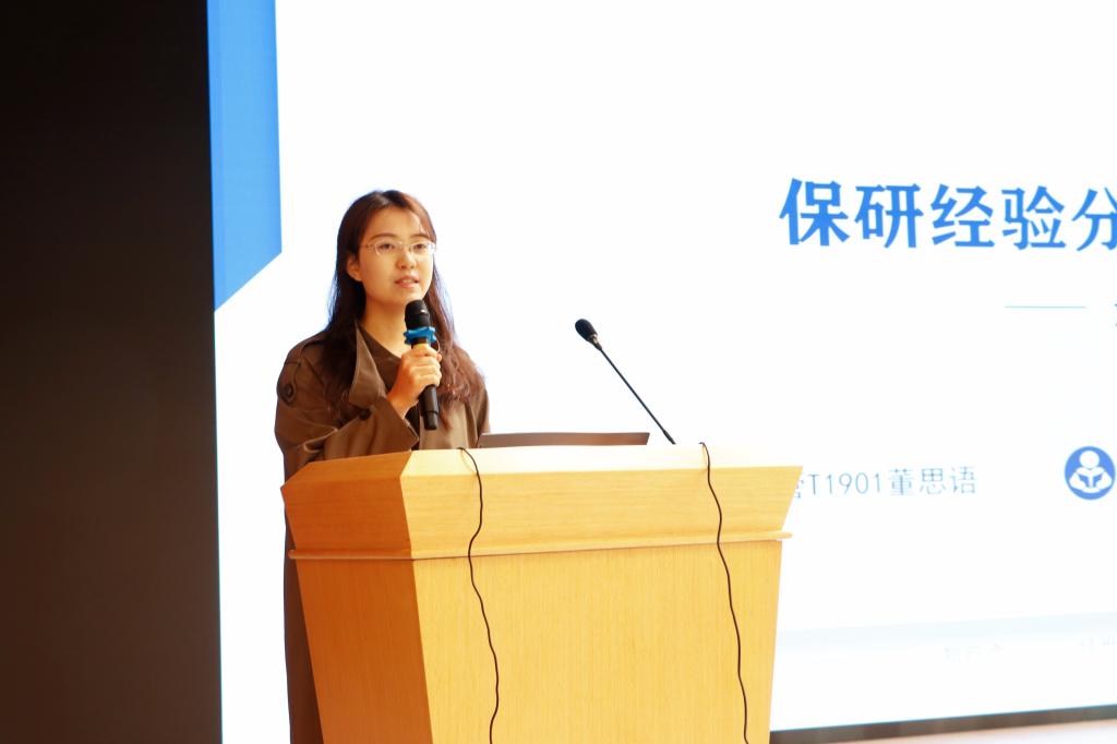 信管T1901董思语进行保研经验分享。她分享了许多保研基本信息和规划,建议大家一旦目标确立就要付之行动,同时,她也指出大二学年是一个分水岭,是知识储备和转化的过程。她建议同学们此时要树立榜样,提高自己的核心竞争力。