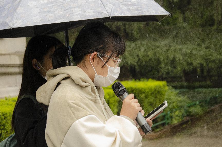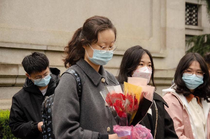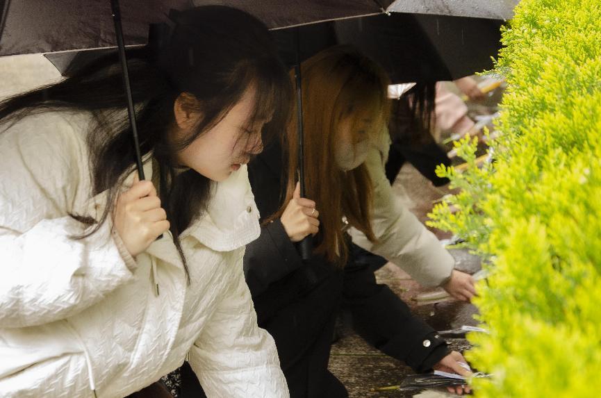 活动伊始,全场庄严肃穆,全体齐声高唱中华人民共和国国歌。志愿者们一一走上前为烈士们献上鲜花,并一起朗诵《人民英雄纪念碑碑文》,感悟每一段文字所蕴含的深刻含义,这既表达了志愿者对革命先烈的敬仰和哀思,也体现了当代青年学子爱国情怀。