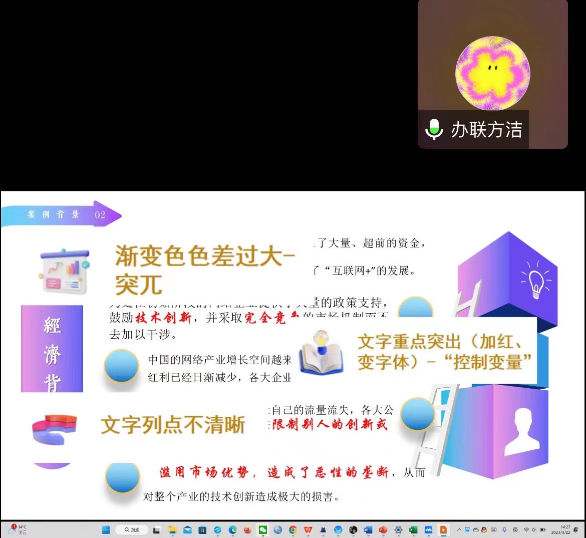 接下来,办公联络部副部长方洁对PPT制作过程中的疑点难点进行分析,深入浅出地讲解了PPT制作技巧及注意事项。她结合三个具体PPT案例,针对其中出现的问题,逐一演示了解决方案。