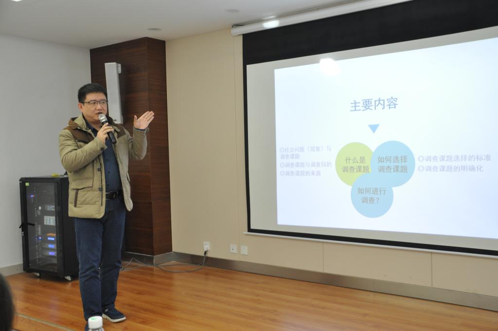 傅沂老师则侧重于对调研的选题讲解。他围绕什么是调查选题、如何选择调查选题及如何进行调查选题三个板块,强调了选题应具有重要性、创造性、合适性以及可行性,并从以往调研选题中给出实例,加深了同学们对选题的了解。同时,他也指出了选题中常见的错误,希望同学们做出有深度、有现实意义的调研选题。