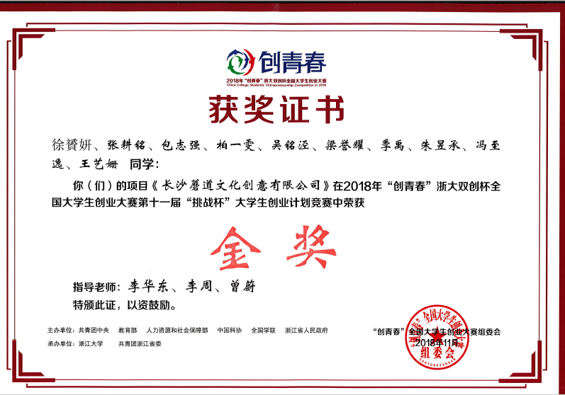 11月3日, 2018年“创青春”浙大双创杯全国老员工创业大赛终审决赛在浙江大学落下帷幕。公司员工团队《长沙蘑道文化创意有限公司》项目获得创业计划竞赛文化创意与服务咨询类金奖,实现了公司参加全国“创青春”大赛文创类金奖零的突破。