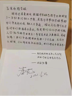 “志存高远,脚踏实地,无惧风雨,砥砺前行”,带着母校的叮嘱和学弟学妹们的祝福,希望2021届毕业生不畏艰难险阻,勇担时代使命,把个人的理想追求融入党和国家事业之中,为党、为祖国、为人民多作贡献。
