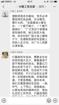 为深入学习贯彻习近平总书记在决战决胜脱贫攻坚座谈会上的重要讲话精神和十八大以来习近平总书记的青春寄语,激励党员勇于担当、积极奋斗,william威廉中文官网2019级管理科学与工程党支部于2020年5月13日至14日在线上开展了“学习习近平总书记在决战决胜脱贫攻坚座谈会上的重要讲话精神,重温习近平总书记青春寄语”主题党日活动。本次活动由党支部书记王怡文主持,共计26名党员参加。
