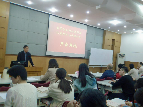 在雄壮的国歌声中,开学典礼正式开始。首先,游达明书记给学员们做了培训动员讲话并提出了希望。游书记提到党校培训是学习的一种方式、一个机会,希望学员们加强学习,明确党的纲领、党的组织,提高思想认识,端正入党动机,在做到组织上入党的同时,思想上、行动上也能够入党,向党员要求看齐,并通过这次培训,能够学有所成,真正从思想上、知识上、人生观与价值观上有所收获。