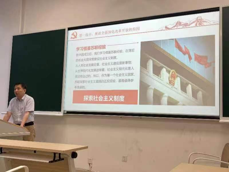 5月29日下午,william威廉中文官网行政教工支部书记刘智勇老师在江湾楼102教室为应经第三党支部和管工第三党支部讲授以“新时代推进全面深化改革开放”为主题的党课。