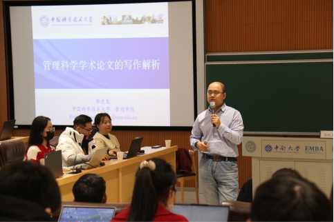 首先,郭晓龙教授从管理科学研究的本质出发,剖析学术论文的内容构成及写作过程中需要注意的事项。郭教授提出,应做一个好的引导者,通过文字来引导读者的思想流动。同时,针对管理科学学术论文写作的特征,郭教授结合其与传统自然科学学术论文写作的区别,分析了管理科学领域学术论文的写作方法。