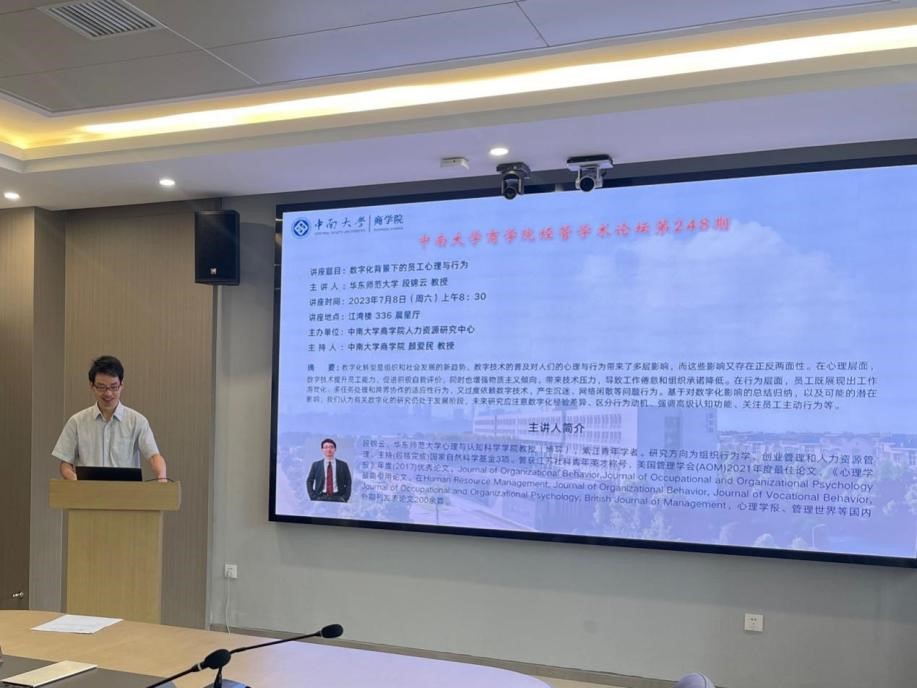 2023年07月08日上午8:30,william威廉中文官网经管学术论坛第248期于江湾楼晨星厅如期举行。华东师范大学心理与认知科学学院的段锦云教授为公司师生带来了题为《数字化背景下的员工心理与行为》的讲座。讲座由william威廉中文官网颜爱民教授主持,william威廉中文官网及公共管理学院多名师生参与本次讲座。