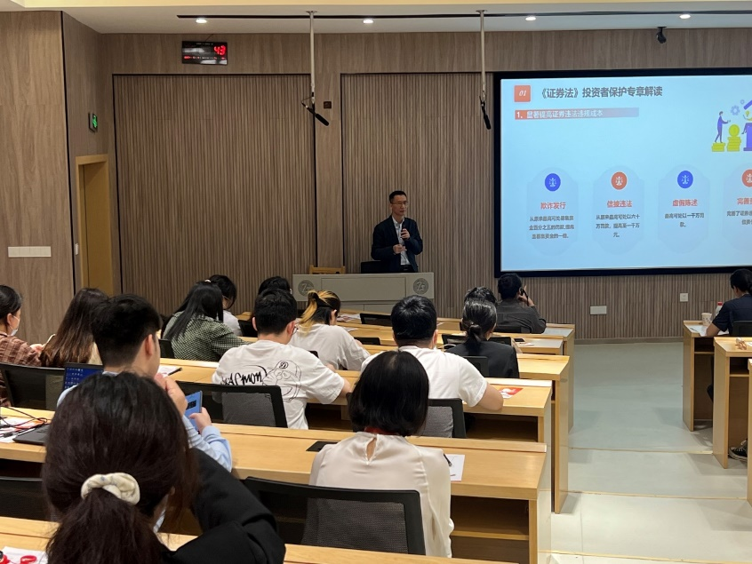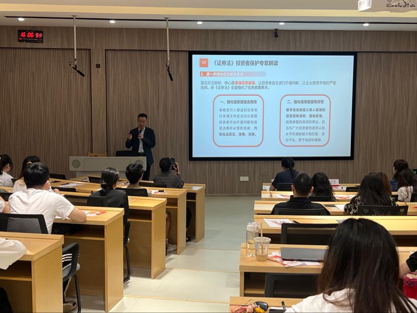 讲座伊始,刘丹岳会长向同学们提出问题:注册制的本质是什么?并对此做出解释:注册制的本质即为让市场对企业做出选择。接着,刘会长对《证券法》中投资者保护专章进行了解读:在信息披露监管方向,信息披露是上市公司与投资者与上市公司之间沟通的重要桥梁,也是投资者决策的重要依据。新《证券法》共有八条,涵盖事前保护、事中保护、事后保护三大方面。具体而言,专章第88条、第95条等条例明晰了投资者适当性、证券集体诉讼的具体含义。刘会长表示:新设的“投资者保护”专章对于提高投资者保护水平、完善投资者保护制度及打造一个规范、透明、开放、有活力有韧性的资本市场提供了坚实的制度保障,具有非常重要而深远的意义。