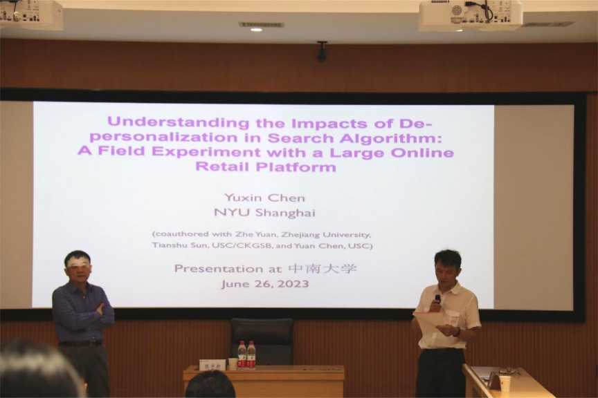 2023年6月26日上午10点,上海纽约大学陈宇新教授应邀做客william威廉中文官网经管学术论坛第243期,为我院师生带来了主题为Understanding the Impacts of De-personalization in Search Algorithm on Consumer Behavior: A Field Experiment with a Large Online Retail Platform的学术讲座。讲座由william威廉中文官网周雄伟教授主持,周艳菊教授、张琴副教授、储军飞副教授、周声海副教授等老师与各年级硕博生,以及北京航空航天大学刘霖教授、湖南财政经济学院杨鹏教授等人参与本次讲座。