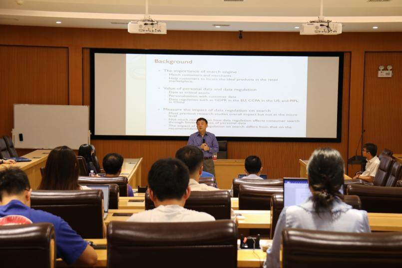 首先,陈宇新教授向大家介绍了该论文目前的投稿状态。随后,基于全球不同国家出台的消费者数据保护政策,陈教授向在场师生们阐述了研究的相关背景,并提出了其核心研究问题——搜索算法去除个性化信息对消费者行为的影响。为了揭示这种影响机制,陈教授团队与世界领先的在线零售平台合作,设计了一个大规模现场实验,并发现:(1)由于搜索算法的去个性化,客户搜索效率和市场交易有所下降;(2)与进行个性化处理的对照组相比,去个性化处理组的顾客在搜索算法返回的产品列表中平均浏览了更多的产品,但点击和购买次数较少;(3)与此同时,对照组的赞助广告点击量和购买量都有所增加;(4)在搜索算法去个性化之后,客户会调整他们对搜索结果的期望,并相应地调整他们的搜索行为。