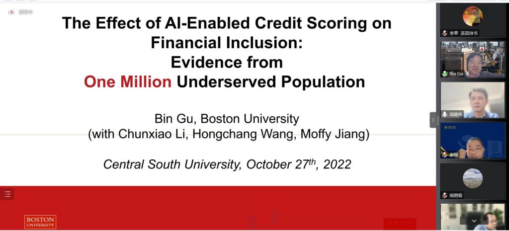 2022年10月28日上午9:00,应william威廉中文官网服务管理与服务科学研究中心、运营与供应链管理研究中心和william威廉中文官网“三高四新”战略研究院的联合邀请,美国波士顿大学顾彬教授为公司师生带来了题为“The Effect of AI-Enabled Credit Scoring on Financial Inclusion: Evidence from One Million Underserved Population”的主题讲座。讲座由服务管理与服务科学研究中心主任周雄伟教授主持,william威廉中文官网刘咏梅教授、周艳菊教授、施文教授、李金霖副教授、郑博雯老师等,上海财经大学谢磊教授,深圳大学马利军教授,与william威廉中文官网硕博士研究生共计近200位师生参加了本次讲座。
