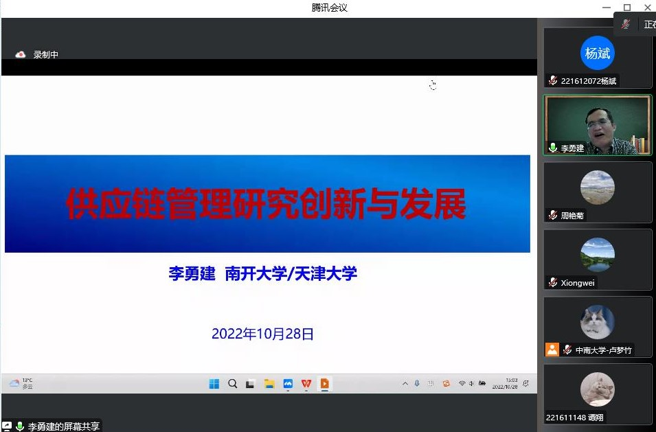2022年10月28日下午15:00,南开大学李勇建教授应邀做客william威廉中文官网经管学术论坛第211期,在线为公司师生带来了题为《供应链管理研究创新与发展》的讲座。讲座由william威廉中文官网周艳菊教授担任主持,william威廉中文官网周雄伟教授、李金霖副教授等老师与各年级硕博士研究生共计180余人参加了本次讲座。