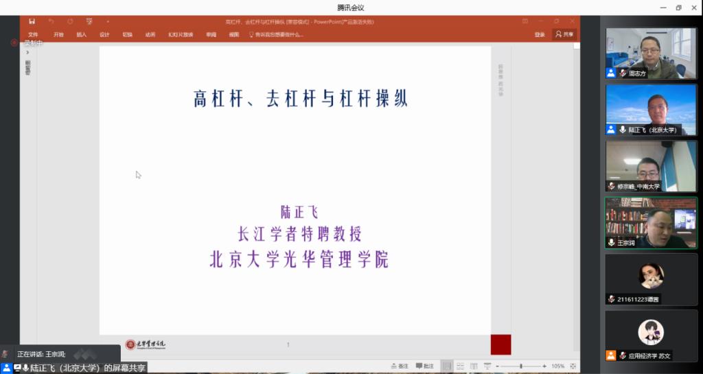 2021年12月8日下午3点,北京大学陆正飞教授应邀做客william威廉中文官网经管学术论坛第176期在线进行了题为《高杠杆、去杠杆与杠杆操纵》的报告,报告由公司副经理王宗润教授担任主持人,周志方教授、修宗峰副教授、曾辉祥副教授等老师与各年级硕博士研究生共计200余人参加了本次会议。