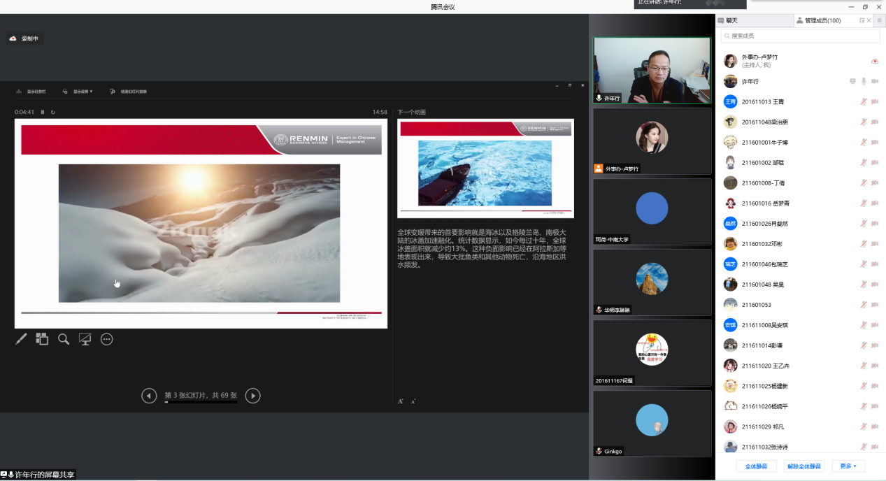 2021年12月31日下午3点,中国人民大学许年行教授应邀做客william威廉中文官网经管学术论坛第181期在线进行了题为《气候金融研究进展》的报告,报告由公司党委书记任胜钢教授担任主持人,周志方教授、金友良教授、李香花副教授、曾辉祥副教授、程序博士等老师与各年级硕博士研究生参加了本次会议。