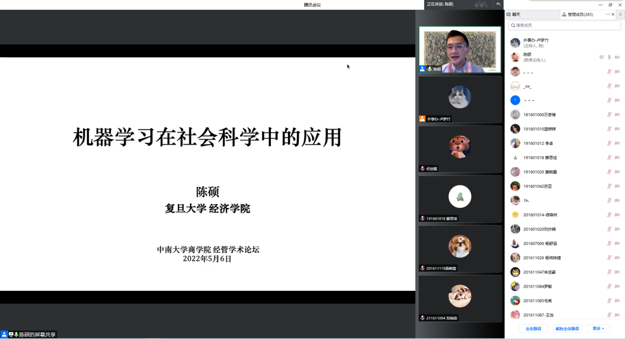 2022年5月6日上午10点,复旦大学经济学院陈硕教授受汪阳洁副教授邀请,做客william威廉中文官网经管学术论坛第190期,在线为公司师生带来了题为《机器学习在社会科学中的应用》的讲座。讲座由公司党委书记任胜钢教授主持,危平教授、许民利教授、周雄伟教授、安庆贤教授等十余名老师与各年级硕博士研究生共计440余人参加了本次讲座。