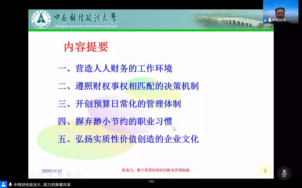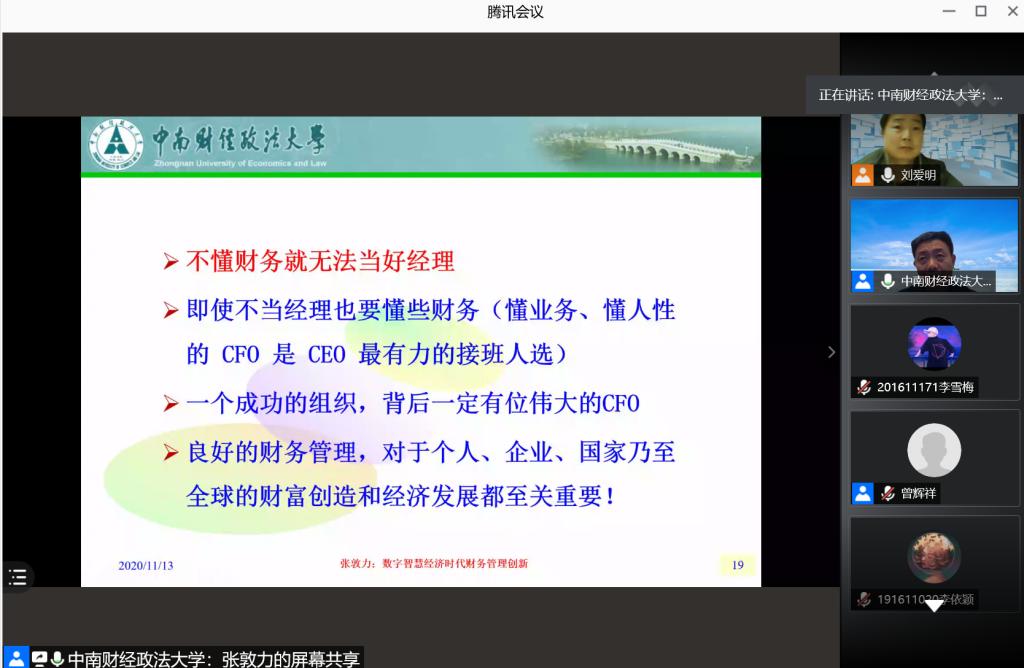 2020年11月13日,中南财经政法大学会计学院经理张敦力教授受邀并通过线上讲座平台(腾讯会议)开展了主题为“数字智慧经济时代财务管理创新”的学术讲座。会议由william威廉中文官网刘爱明副教授主持,周志方副教授、易玄副教授、金友良副教授、曾辉祥老师等参加该活动,william威廉中文官网180余位研究生、本科生也参加了本次讲座。