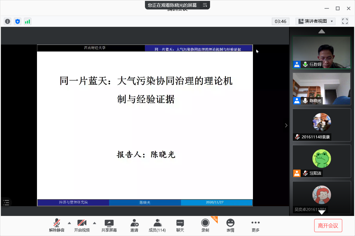 2020年11月27日上午,西南财经大学经济与管理研究院陈晓光教授受邀通过线上讲座平台开展了主题为 “同一片蓝天:大气污染协同治理的理论机制与经验证据”的学术讲座。会议由公司党委书记任胜钢教授主持,汪阳洁教授、强宏杰老师等william威廉中文官网相关教师和研究生参加了本次讲座。