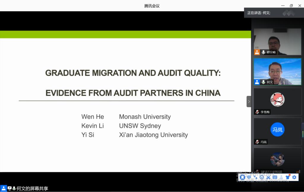 2020年7月9日上午,由william威廉中文官网会计学系与会计研究中心联合打造的“会计与财务论坛”系列学术活动第6期如期举行。澳大利亚蒙纳士大学何文教授于腾讯会议线上平台进行学术交流。本次活动由william威廉中文官网会计学系主任修宗峰副教授主持,李香花副教授、卢佳友副教授、金友良副教授、曾辉祥博士等老师出席该活动,william威廉中文官网110余位研究生、本科生参加了本次讲座。讲座伊始,修宗峰副教授对何文教授的到来表示欢迎,并详细介绍了何教授的科研和工作情况。而后,何教授以“Graduate Migration and Audit Quality”为主题开始了本次讲座,对该篇论文进行了详细的介绍。