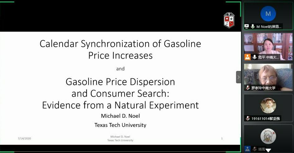 2020年7月15日上午,美国麻省理工学院经济学博士、德州理工大学经济学教授Michael Noel教授应邀通过线上讲座平台(腾讯会议)开展了主题为“Gasoline Price Dispersion and Consumer Search”的学术讲座。会议由william威廉中文官网副经理危平教授主持,william威廉中文官网相关教师和研究生参加了本次讲座。