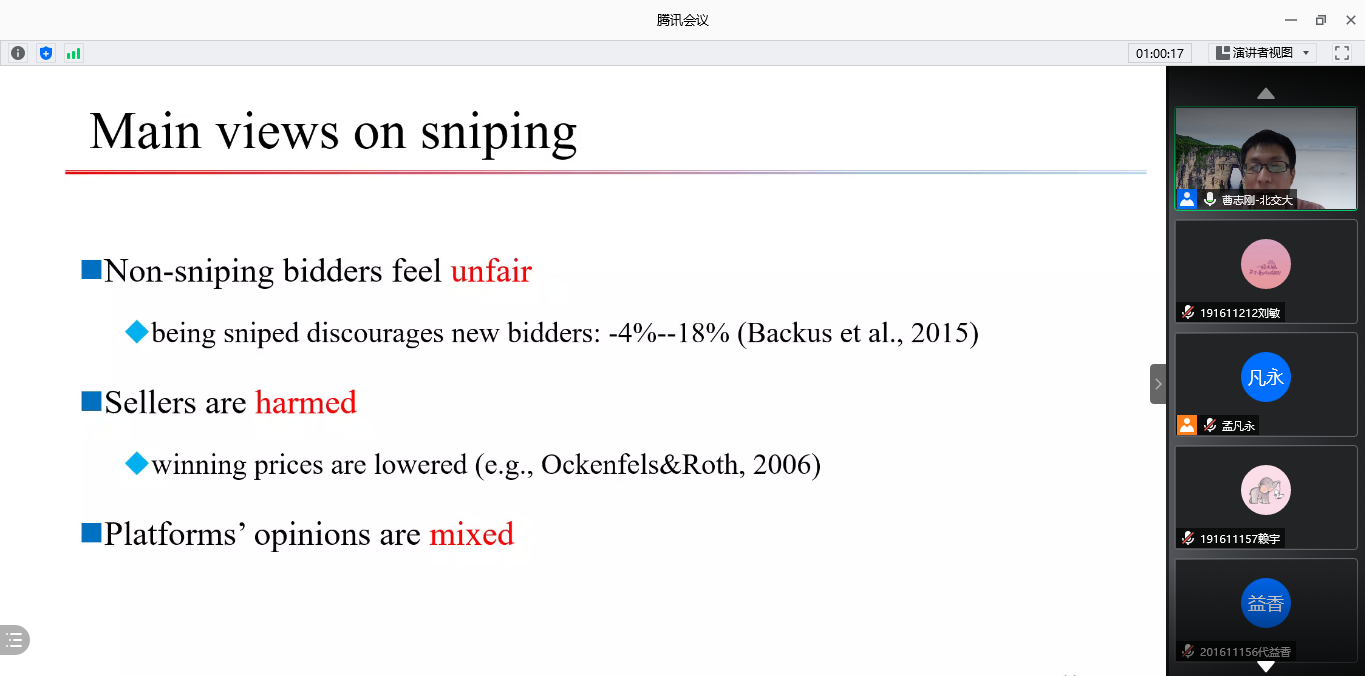 2020年9月23日下午,北京交通大学经济管理学院曹志刚教授应邀来访,并通过线上腾讯会议平台开展了主题为“Snipings in Sofe-close Online Auctions”的学术讲座。会议由william威廉中文官网孟凡永教授主持,william威廉中文官网安庆贤副教授等相关教师、博士和研究生参加了本次讲座。