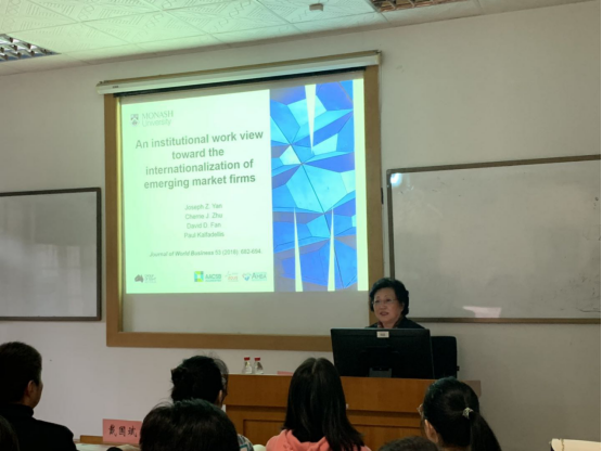 讲座伊始,朱教授介绍了自己的一些学习经历,并以亲身经验告诉听众做学术科研要有兴趣和热情并付出踏实的努力,而不能有功利性思维。朱教授认为做学术研究首先应该寻找研究问题,确定自己要问的是什么,要看的是什么。然后,确定关键词,并根据关键词来搜取大量优质相关文献并广泛阅读。随后,朱教授按照Literature review、Theoretical framework、Maintenance institutional work、Disruptive institutional work四个模块讲解了An institutional work view toward the internationalization of emerging market firms这篇论文。论文主要内容为政府通过所有制来控制企业,因此政府决策会对所有企业产生影响。企业和政府之间应该通过沟通交流来做出反应,采取适当应对措施。同时,有些市场行为会破坏社会制度。比如地下钱庄的出现,会破坏银行贷款制度,导致大量资金外流,严重破坏原本的金融系统运作。所以,为了制度的良好延续和进步,政策不应该是一成不变的,需要不断调整和完善。通过去除无效政策,完善制度创新。朱教授的这篇定性文章从一个新的角度出发,思考政府发起的经济发展制度环境的演变,介绍了组织工作理论,推进了IB理论进展。