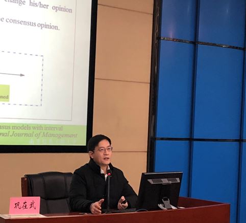巩在武教授此次报告的主要内容为群体共识系列建模,他首先介绍了共识的概念,提出了协调者和决策个体的概念,运用不同效用函数描述不同人的偏好,构建了带有社会偏好的网络模型。巩教授还介绍了群体共识系列建模2机会约束下区间不确定判断群体决策建模研究,他分别从服从线性分布的区间判断矩阵机会约束排序建模和服从正态分布的犹豫模糊语言判断矩阵建模、服从随机分布直觉模糊判断矩阵排序建模、服从随机分布的多元偏好关系群体决策建模这四个方面展开报告。