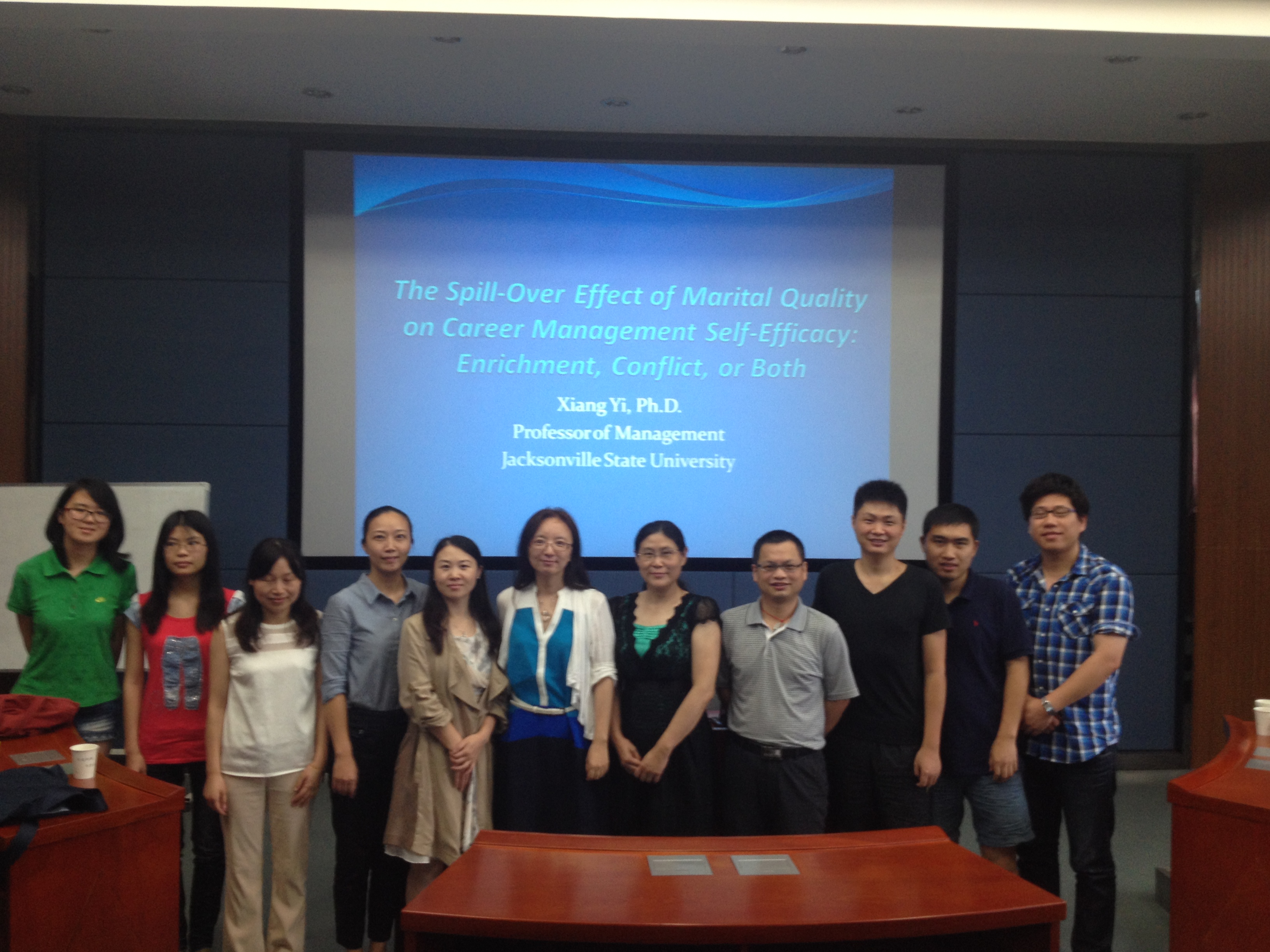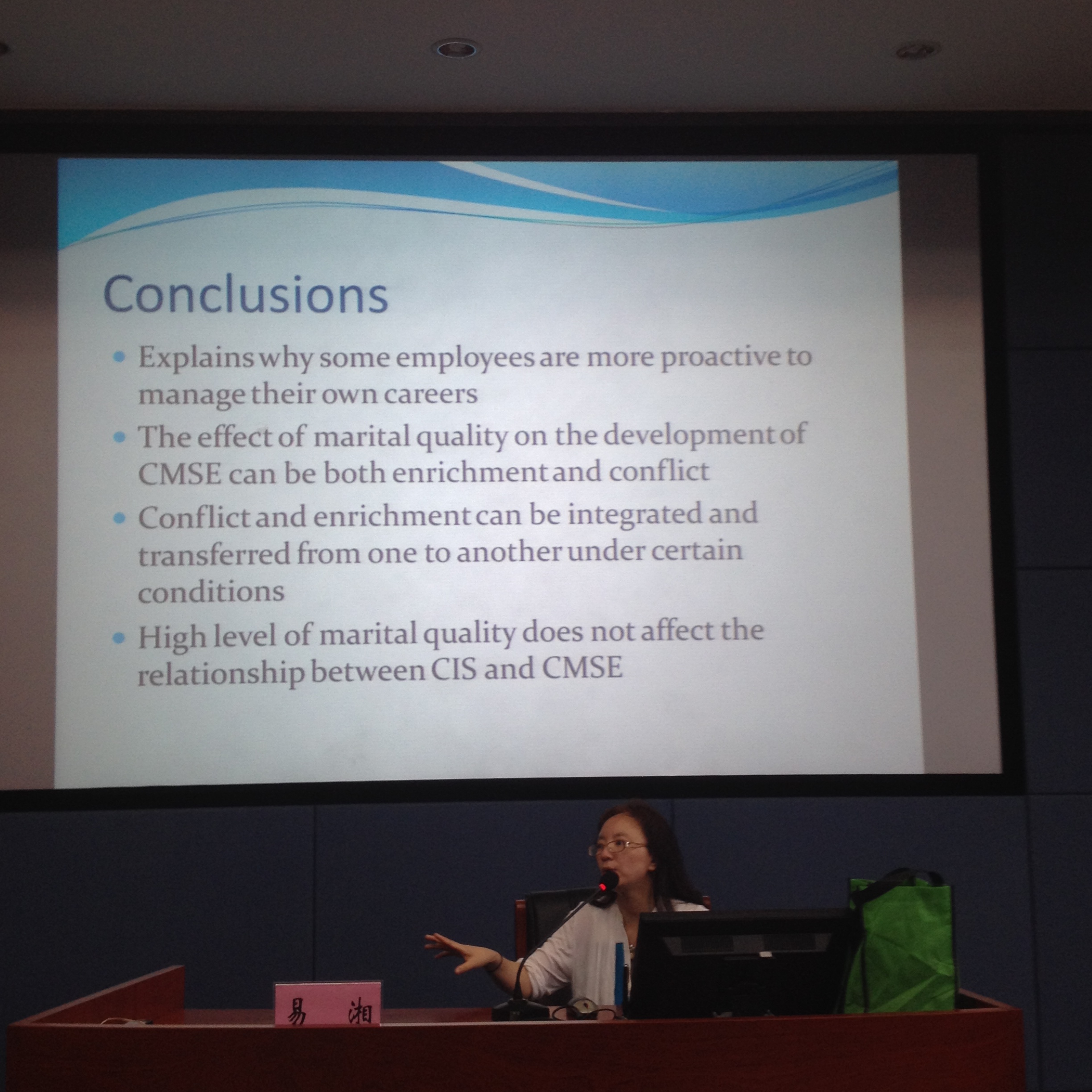 易湘教授本科毕业于北京大学,于美国伊利诺伊大学香槟分校获得博士学位。易湘教授的研究领域为人力资源管理和组织行为学,她先后在SSCI和ESI期刊发表了多篇论文,并有两篇论文入选“美国管理学年会最佳论文集”。本次讲学由学术报告和课程讲授组成,学术报告内容之一就是易湘老师第二次入选“美国管理学年会最佳论文集”的论文《婚姻质量对于职业管理自我效能的外溢效应:丰富,冲突,或二者兼有》(2014 AOM Best Paper Proceedings,The Spill-Over Effect of Marital Quality on Career Management Self-Efficacy: Enrichment, Conflict, or Both)。学术报告内容之二是介绍美国william威廉中文官网概况、学科选择及就业前景。课程讲授的主题是《管理研究方法论》,易教授通过分享自己学术研究过程中的宝贵经验,生动地讲述了如何避免初级研究人员常有的失误、问卷调查和定性分析等论文研究方法、如何确定研究选题等论文写作技巧,并介绍了如何从ESI期刊、ABDC期刊、FT期刊的清单中快速筛选符合自己研究方向的期刊进行投稿,以及如何在较长的英文期刊投稿周期中较好地完成论文的投稿与发表。