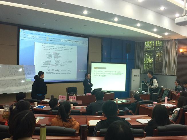 JoongHo AHN教授以 “A Study on the Trends in Korean ICT Technology through Patent Analysis”为题,与在场的老师和同学们进行了精彩的学术交流。AHN教授利用社会网络分析模型对韩国2000-2014年15年间的专利应用情况进行分析,根据分析结果总结了韩国本土ICT技术融合的演化规律,并对韩国移动产业ICT技术的发展趋势进行了预测。 在互动提问环节,AHN教授就crowdsourcing(群众外包)技术的相关问题进行了详细回答,并对crowdsourcing技术在我国发展的注意事项给出了自己的建议。