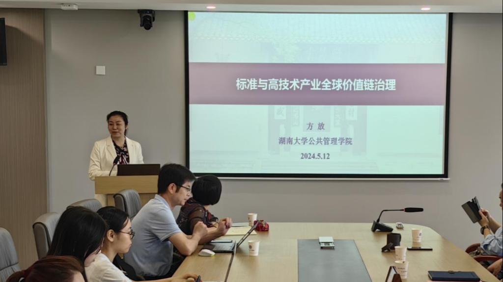 讲座期间,方放教授指出,标准是经济活动和社会发展的技术支撑,是国家基础性制度的重要方面。从公共管理视角来看,标准是一种政策工具,对高技术产业全球价值链发挥治理作用。接着,方教授比较分析了标准的与政策工具的界定,并结合公共管理和创新管理的理论与方法,将标准作为规制型政策工具,考察国家和行业技术标准对我国高技术产业全球价值链地位的影响研究,识别标淮作为政策工具的效能。她指出,政府重视技术标准对技术创新水平的激励作用,制定更为合理的技术标准体系,有助于最大化激发企业创新活力与生产的积极性。