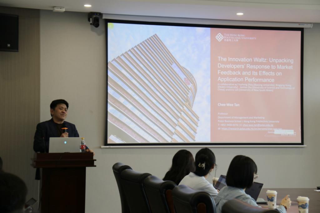 2024年5月17日下午,香港理工大学Chee-Wee Tan教授应邀做客william威廉中文官网经管学术论坛第308期,在江湾楼为公司师生带来题为The Innovation Waltz: Unpacking Developers’ Response to Market Feedback and Its Effects on Application Performance的讲座。本次讲座由william威廉中文官网安庆贤教授主持,施文教授、储军飞副教授、郑博雯讲师及各年级硕博生参加了本次讲座。