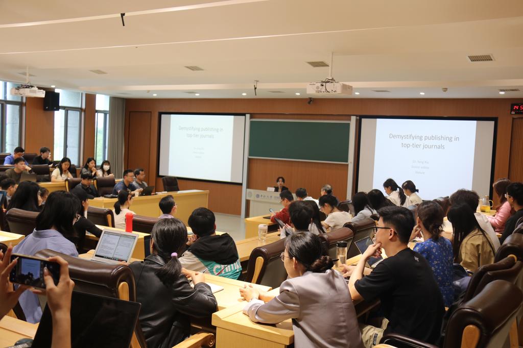 接着,夏博士从微观层面为师生讲解撰写论文的三大原则:第一,故事具有创新性;第二,充分经典的论据支撑;第三,正式专业的语言。同时,她指出,一篇好文章的写作包括以下步骤:选择一个好的话题、进行重点文献的回顾、写作、修改和编辑。此外,她还从编辑者的角度为我们展示了一篇论文从投递到最终刊登的完整编辑周期,并鼓励在场师生积极投递稿件。