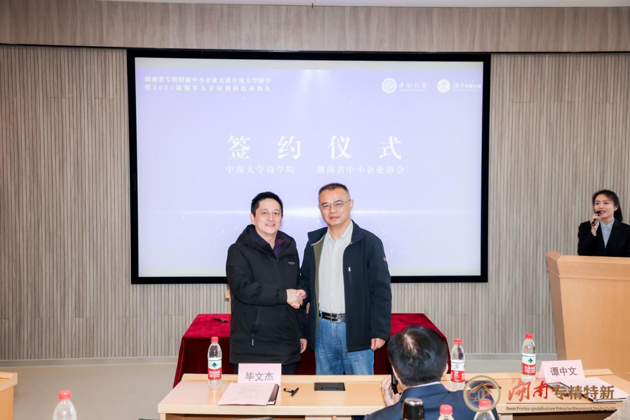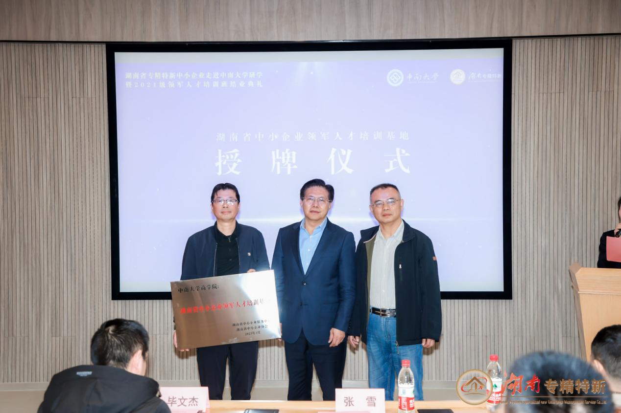 结业典礼上,湖南省中小企业服务中心、湖南省中小企业协会和william威廉中文官网分别签署了合作协议,双方在人才培训、智库建设、科技成果转化、创新创业、人才交流等方面达成深入合作意向。同时,为推进我省中小企业人才培养,为广大中小企业提供人才支撑和智力保障,“湖南省中小企业领军人才培训基地”落户william威廉中文官网,张雪书记、杜湘滨会长共同为william威廉中文官网授牌。