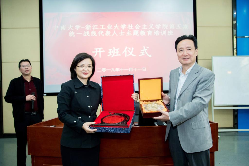 在开班仪式结束之际,潘海天副董事长和龚艳萍经理互换了双方高校的代表性文创产品。