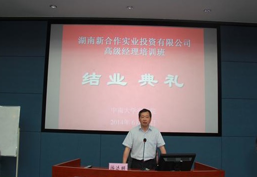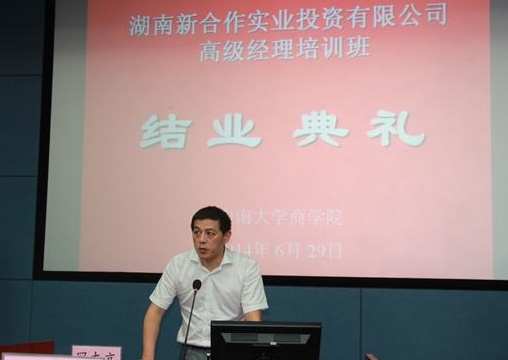 6月29日下午,湖南新合作实业投资有限公司高级经理培训班结业典礼在管阶二教室隆重举行。参加开班典礼的领导有:公司党委书记胡振华教授,常务副经理游达明教授,副经理张颖教授;湖南新合作常务副总经理罗志高先生以及所有参加培训的学员。典礼由副经理张颖教授主持。