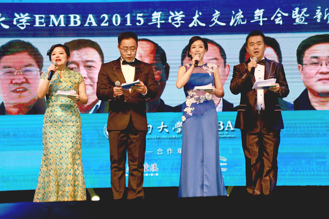 晚会主持人:EMBA六班王文(左一)、夏伟辉(左二);EMBA四班王勇(右二)、胡南(右一)
