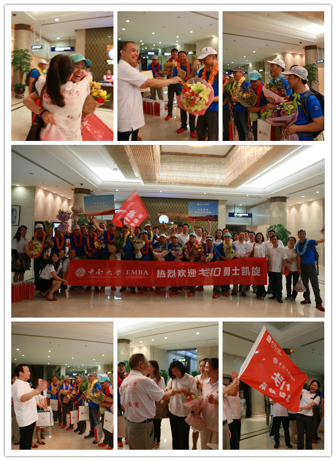在EMBA联合会和EMBA管理中心的精心组织下,30余位戈十一预备战队的同学们自发地来到机场迎接戈十英雄们的归来。在大家的翘首企盼中,戈十勇士们身着统一的战袍走出机场,“勇者不凡,唯我中南,戈壁英雄,欢迎回家……”的口号声响彻夜空。热情的同学们一拥而上,为勇士们佩戴花环,献上鲜花和精心准备的礼物,大家以经久不息的掌声和欢呼声向英雄们表达深深的敬意,感谢他们在茫茫戈壁上展现中南人的精神和风采,感谢他们为学校拼搏而来的荣誉,感谢他们以自己的实际行动践行“理想行动坚持超越”的理念,为所有人传递的正能量。