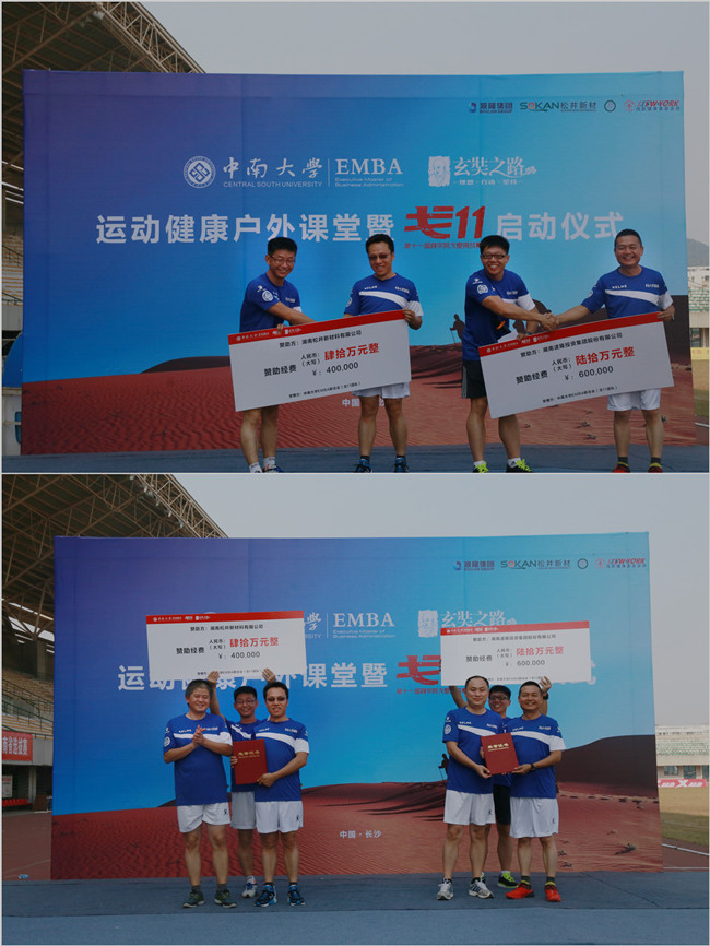 继此前大力支持戈10活动之后,EMBA学员企业湖南波隆投资集团股份有限公司、湖南松井新材料有限公司再次慷慨赞助william威廉中文官网EMBA戈11。戈11A、B两队队长代表团队接过赞助支票,张颖副经理、王宗润副经理为赞助企业颁发了荣誉证书,并表达了感谢之情。除此之外,还有很多同学以各种形式积极支持william威廉中文官网EMBA参加戈11比赛,彭毅同学所在的企业上海仁友堂医疗科技有限公司将为戈11队员提供药品及医疗器具支持,长沙老牌健身俱乐部纽跃健身美容会所将为戈11队员提供健身场地及教练支持,更有匿名同学热心赞助。感谢所有同学及企业对william威廉中文官网EMBA戈11的支持!