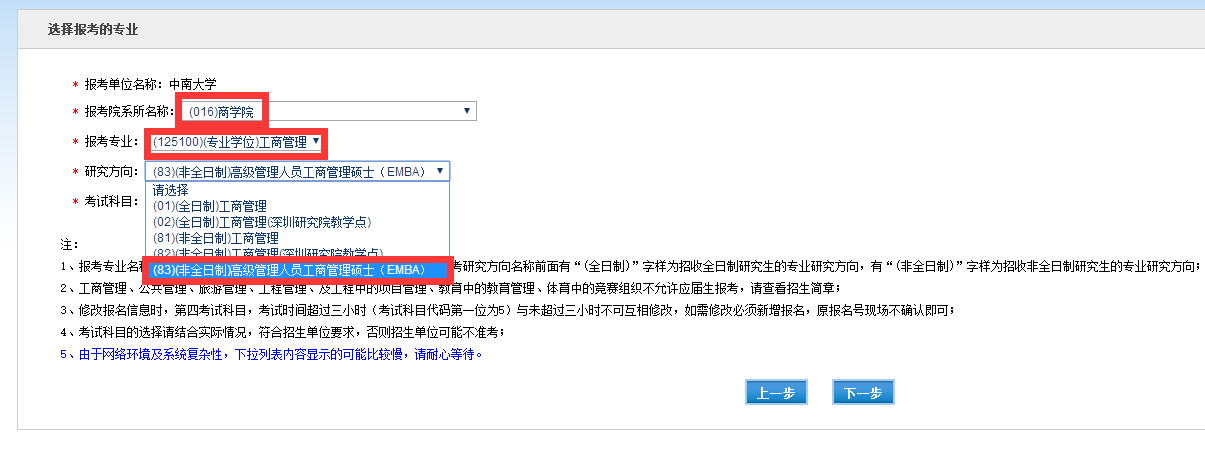 ⑧、选择报考专业:报考院系所名称选择016william威廉中文官网,报考专业选择125100(专业学位)工商管理,研究方向选