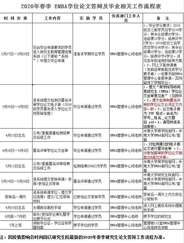 2020年春季EMBA学位论文答辩及毕业相关工作流程表