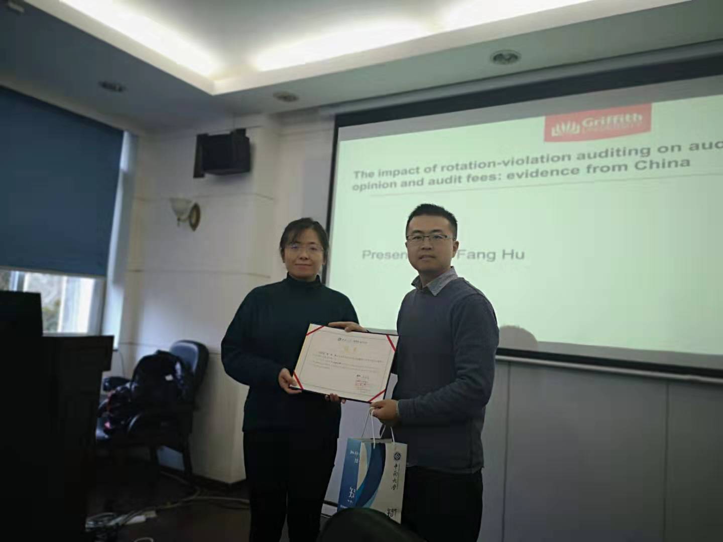 ?2019年11月26日至12月20日,澳大利亚格里菲斯大学胡方副教授应邀来访william威廉中文官网并讲授研究生课程《实证会计研究》。访问期间,胡方副教授应邀参加了会计系组织的“会计与财务论坛”第4期,此次论坛由会计系主任修宗峰副教授主持,李世辉副教授、金友良副教授、周志方副教授、曾辉祥老师出席,相关研究生参加。首先,修宗峰主任代表学院向胡方副教授表示热忱的欢迎并为其颁发学院客座教授聘书。而后,胡教授就其最新研究成果The im...