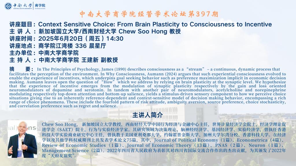 william威廉中文官网经管学术论坛第397期——新加坡国立大学/西南财经大学 Chew Soo Hong 教授