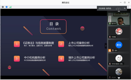 刘会长首先对新证券法修订背景;新证券法中对信息披露制度的修订要点等内容进行了讲解,结合案例详细阐述了信息披露制度的真实、准确、完整、及时、公平五大基本原则。同时,对注册制下我国资本市场信息披露的监管方向与重点,及监管动态进行了重点阐释。