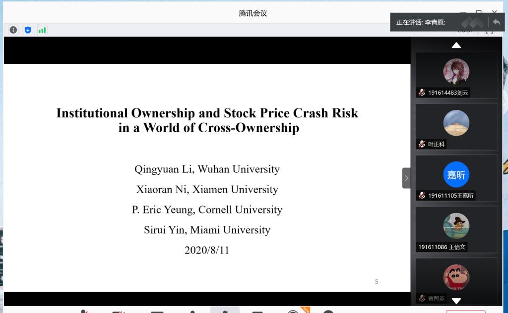 讲座伊始,李教授从目前财务会计研究的一些背景选题,提出论文写作要学会将新旧背景、经典选题、不同学科进行交叉,并且每天要追踪最新期刊文献、了解学术研究动态前沿以启发新的选题。而后,李教授介绍了关于交叉持股、股价崩盘风险相关研究,引入自身正在写作的论文 “Institutional Ownership and Stock Price Crash Risk in a World of Cross-Ownership”。接下来,李教授从选题的动机、文献回顾、研究结果和贡献以及数据分析等几个方面对该篇论文进行了详细的解说。该篇论文新颖的角度、严谨的分析过程、详实的数据资料使在座老师同学对论文写作产生了新的思考。