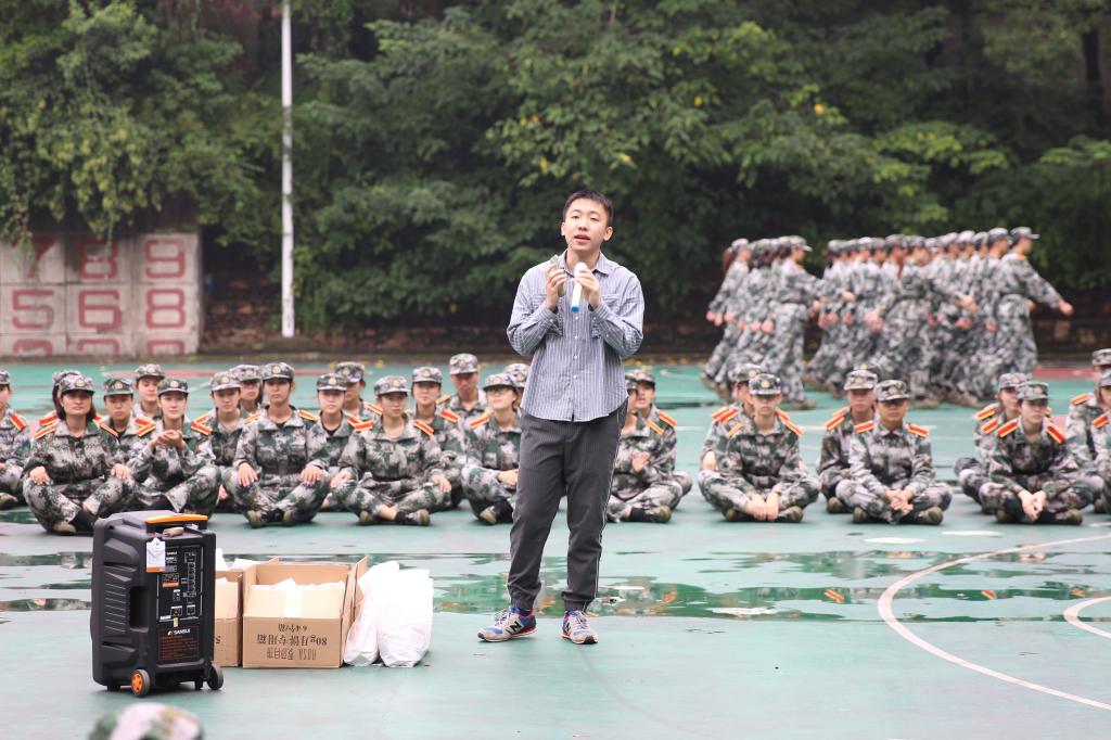 任胜钢书记用“苦不苦?想想红军两万五!”“累不累?想想革命老前辈!”的经典问答展开互动。他向学员们提问军训的意义,并从国际政治形势出发,指出我国和平年代的潜藏危机,据以说明强大的国家军队是和平盛世的必要条件,得出军训意义在于让学员体悟和平的珍贵。之后,他提出所有学员应当向军人学习、用优秀成绩向学校汇报、向解放军致敬的要求。