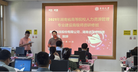 随后,新道科技股份有限公司湖南省区总经理侯腾飞致辞。在发言中侯总首先感谢william威廉中文官网在此次培训中提供的支持与帮助,对于此次参训的老师们表达由衷的欢迎。今年也是新道科技有限公司成立的第十年,作为平台型教育服务企业,新道教育希望汇聚政府、行业、企业、院校多方力量,共同服务院校数智人才培养,服务产业升级,推动中国教育事业和中国数字经济的进步与发展。