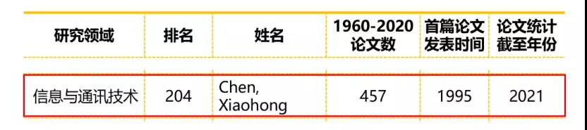 公司名誉经理陈晓红院士荣登榜单,在信息与通讯技术领域国内上榜的777位学者中位列第204位,充分彰显了陈院士在同行之中的重要学术影响力。