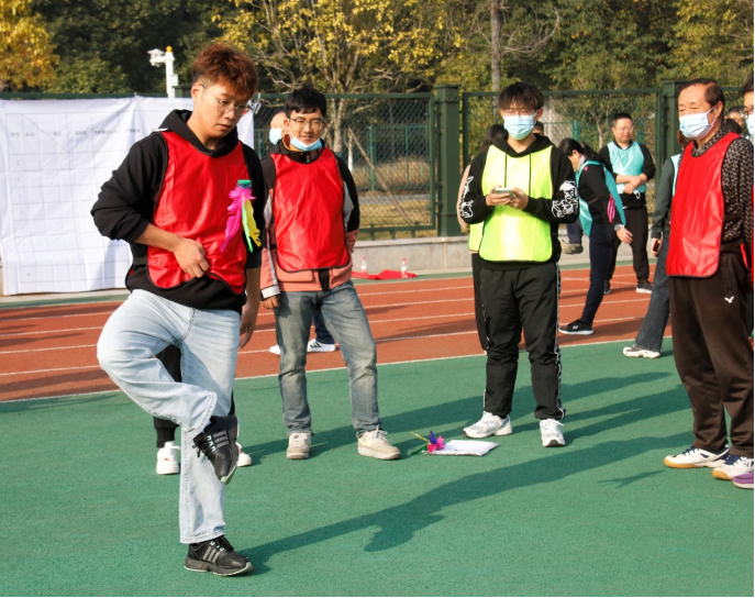 在“一分钟踢毽子”项目中,气氛变得更加紧张热烈,大家都抓紧了每一秒的时间进行毽子接力,小小的毽子划过一道道弧线,交织着欢声笑语。