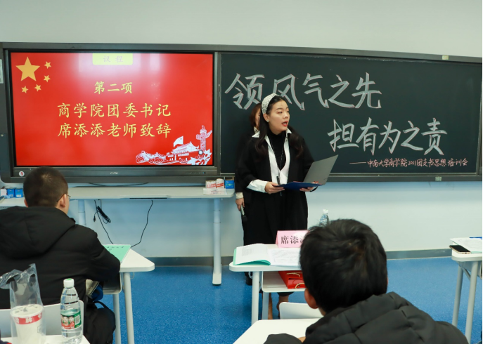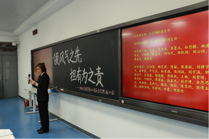 而后席书记发表讲话。她首先对各班团支书的辛勤付出表达了感谢,同时表示,在共青团建团100周年的关键节点,他们要贯彻好党的十八大政策,一起将接下来基层团建工作的重点抓好、抓实。最后,席添添老师寄语:“时代造就青年,青年贡献时代,我们要在乱云飞渡中把握正确政治方向,在风险挑战面前砥砺胆识,开启属于我们这一代人的历史伟业。”